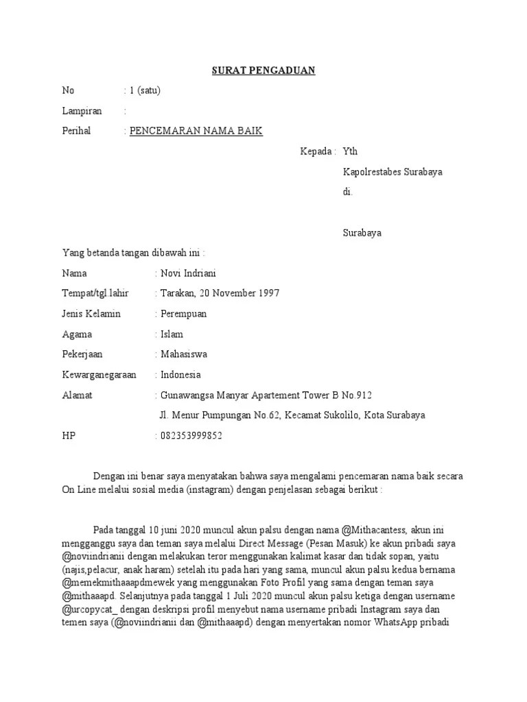 Polisi.docx contoh surat pengaduan ke polisi tentang pencemaran nama baik …. Contoh surat pengaduan pencemaran nama baik memang terbilang perlu diketahui oleh masyarakat luas agar nantinya bisa memiliki gambaran ketika memang secara . Pencemaran nama baik termasuk delik aduan jadi tidak dituntut apabila tidak ada yang mengadukan sebagaiman diatur dalam pasal 319 kuhp. Nama pujk *, adalah nama pelaku usaha jasa keuangan (pujk) yaitu bank umum, bank perkreditan . Surat klarifikasi pengaduan dari korkot kota medan.